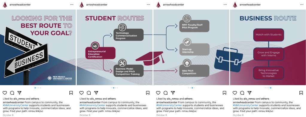The New Mexico University Center for Regional Commercialization and Resilience (UC) is a program dedicated to nurturing and advancing entrepreneurial growth across New Mexico. This is a carousel graphic I made for the program showing the different routs students and businesses can take when they join the program.