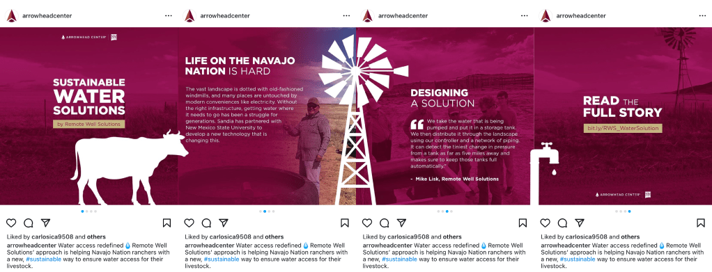 This is a carousel media graphic I created for this article about one of our clients from the Arrowhead Center, and their innovation that’s bringing water to the Navajo Nation. The graphic contains some of the most important and engaging information from the article to promote both the article and the client.